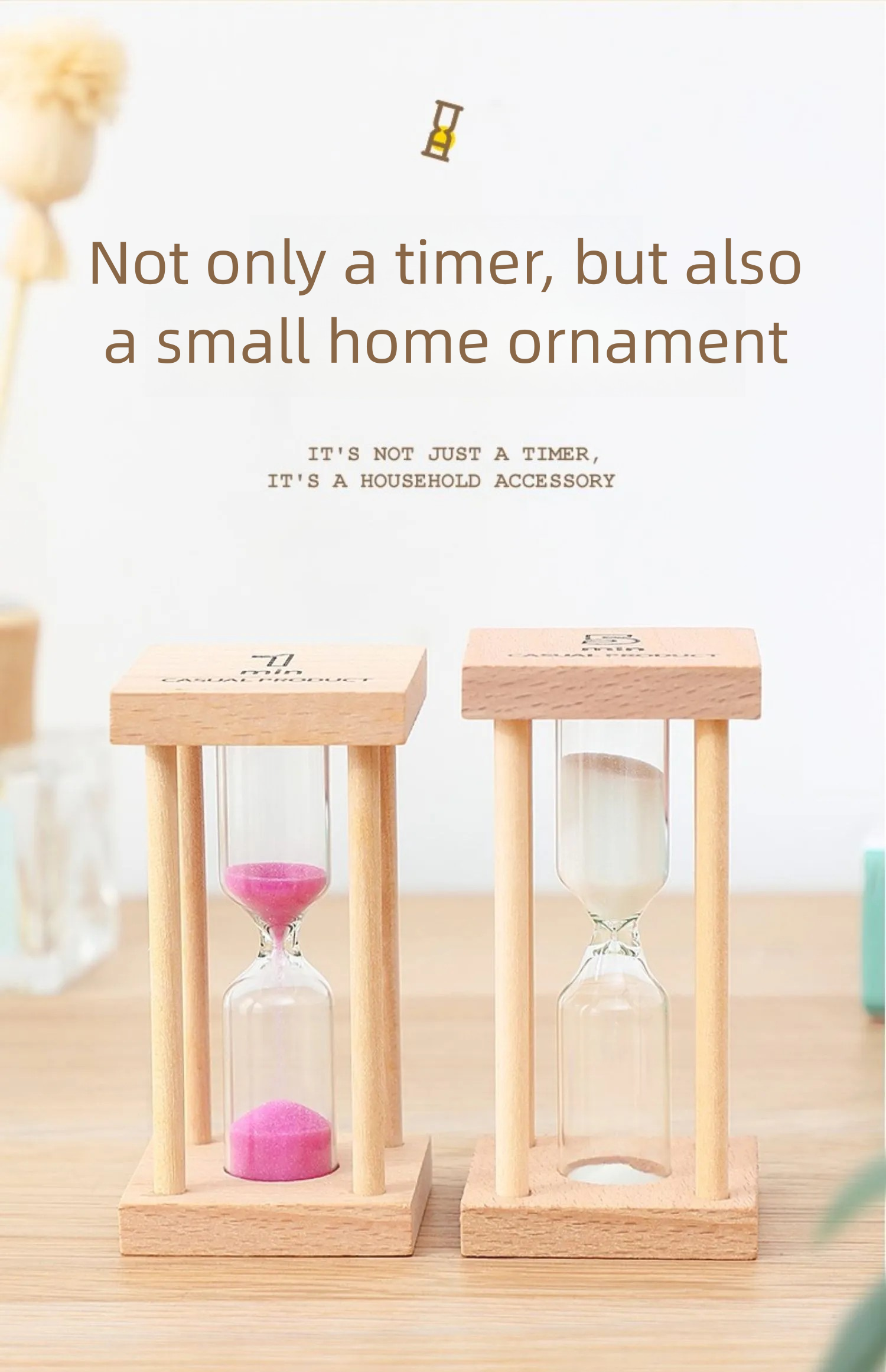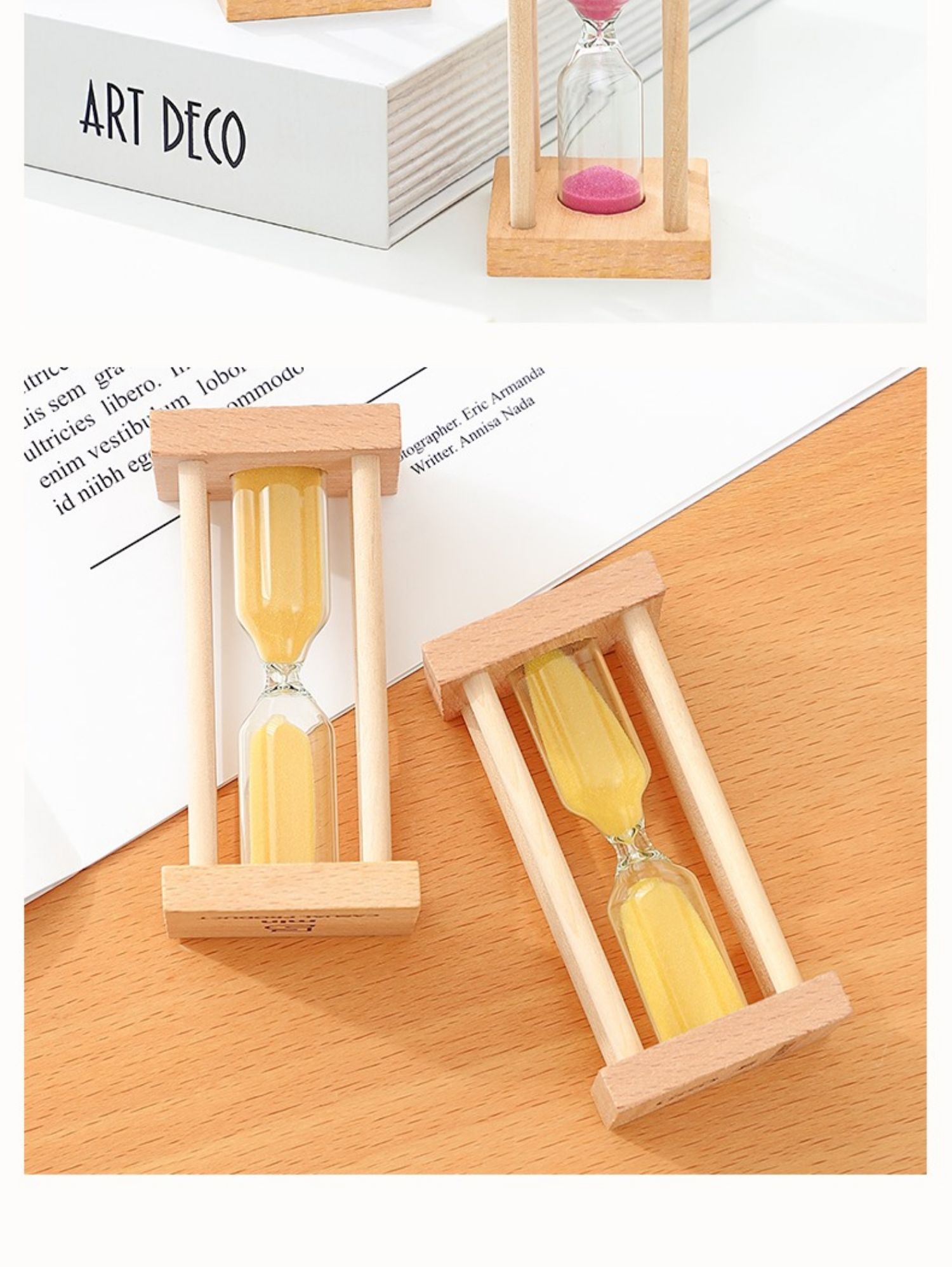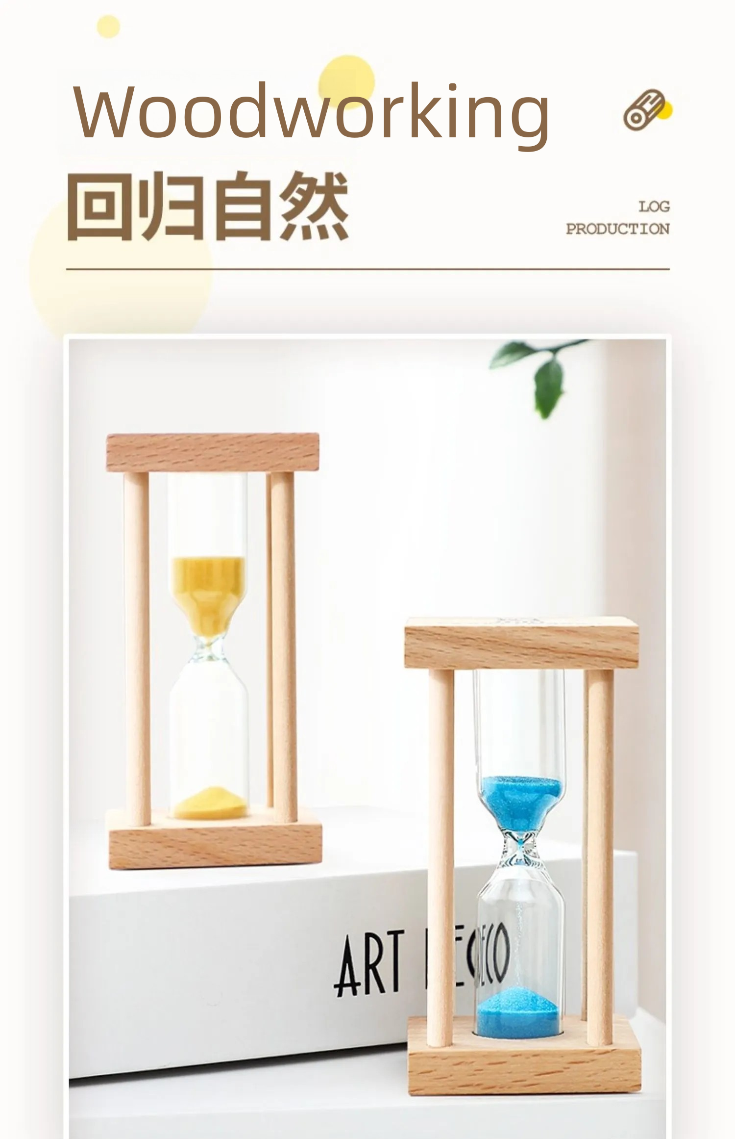 The 5-minute log wooden seat hourglass can also be made into the same hourglass with less than 5 minutes, such as 3 minutes. 4 minutes. 3 minutes or even 30 hourglass. The sand color, hourglass time and wood material can be customized according to the customer's requirements. The wood has two square surfaces that can be printed or engraved with LOGO or other text or patterns, which is very suitable for decoration on office desks or home study rooms.